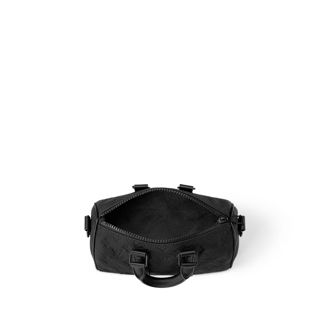 モノグラムエクリプス リバース キャンバスにターコイズカラーのレザーでトリミングを施したキーポルバンドリエール 25。バッグを補強するサイドバンドとトップハンドル、ネームタグのすべてを鮮やかな色合いで仕上げた、エネルギッシュな雰囲気のコンパクトバッグです。マットブラックのメタルパーツとブラックの取外し & 調節可能なテキスタイルストラップがデザインを完成させます。