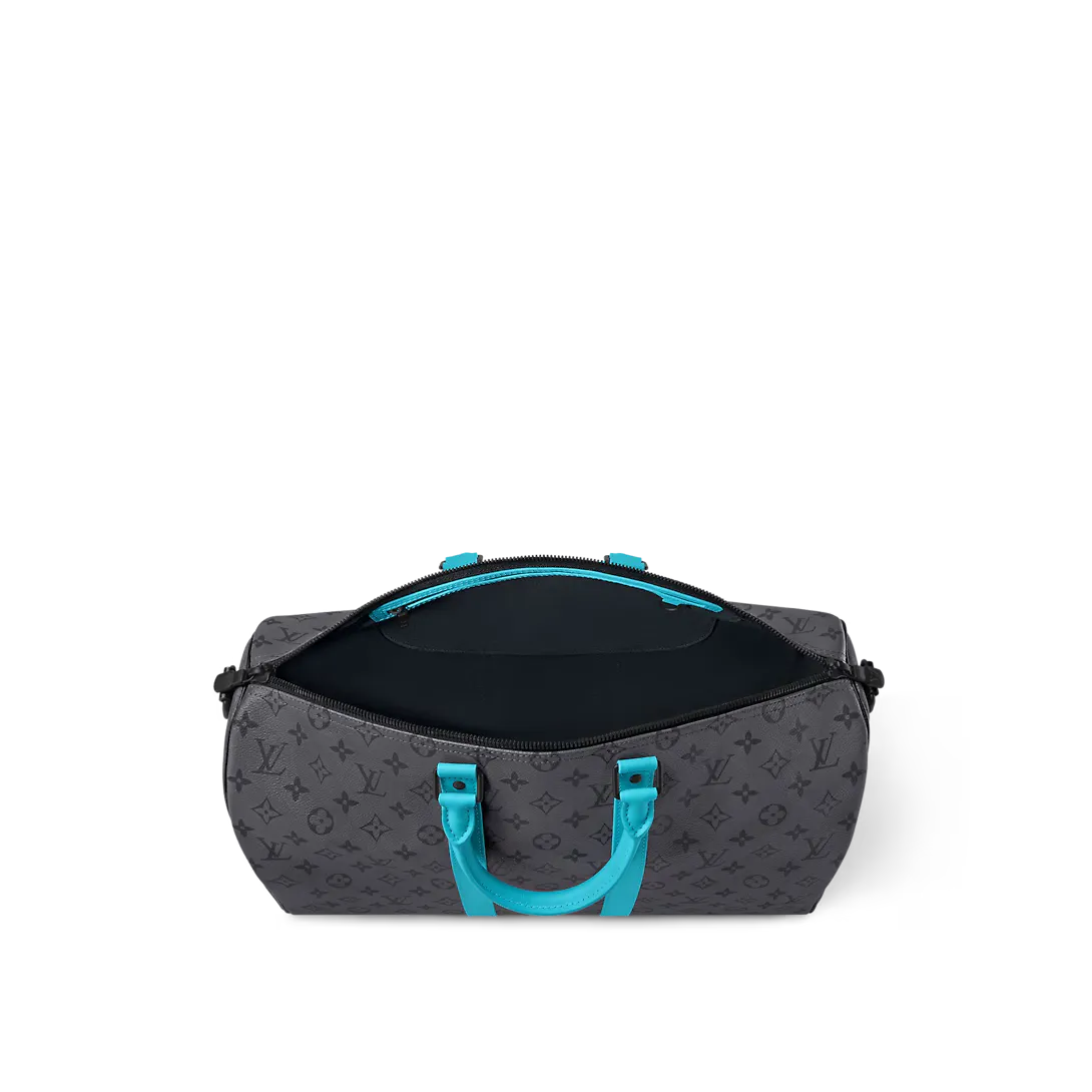 モノグラムエクリプス リバース キャンバスと、エネルギッシュなターコイズカラーのレザーのトリミングを組み合わせたキーポルバンドリエール 45。グレーのキャンバス地に際立つ、マットブラックのメタルパーツとターコイスブルーのレザーでフレッシュにアップデートした、機内持ち込みが可能(航空会社や使用する機材によって条件は異なります)なバッグです。ライニングを施した内装には、貴重品用のファスナー付きポケットをあしらいました。