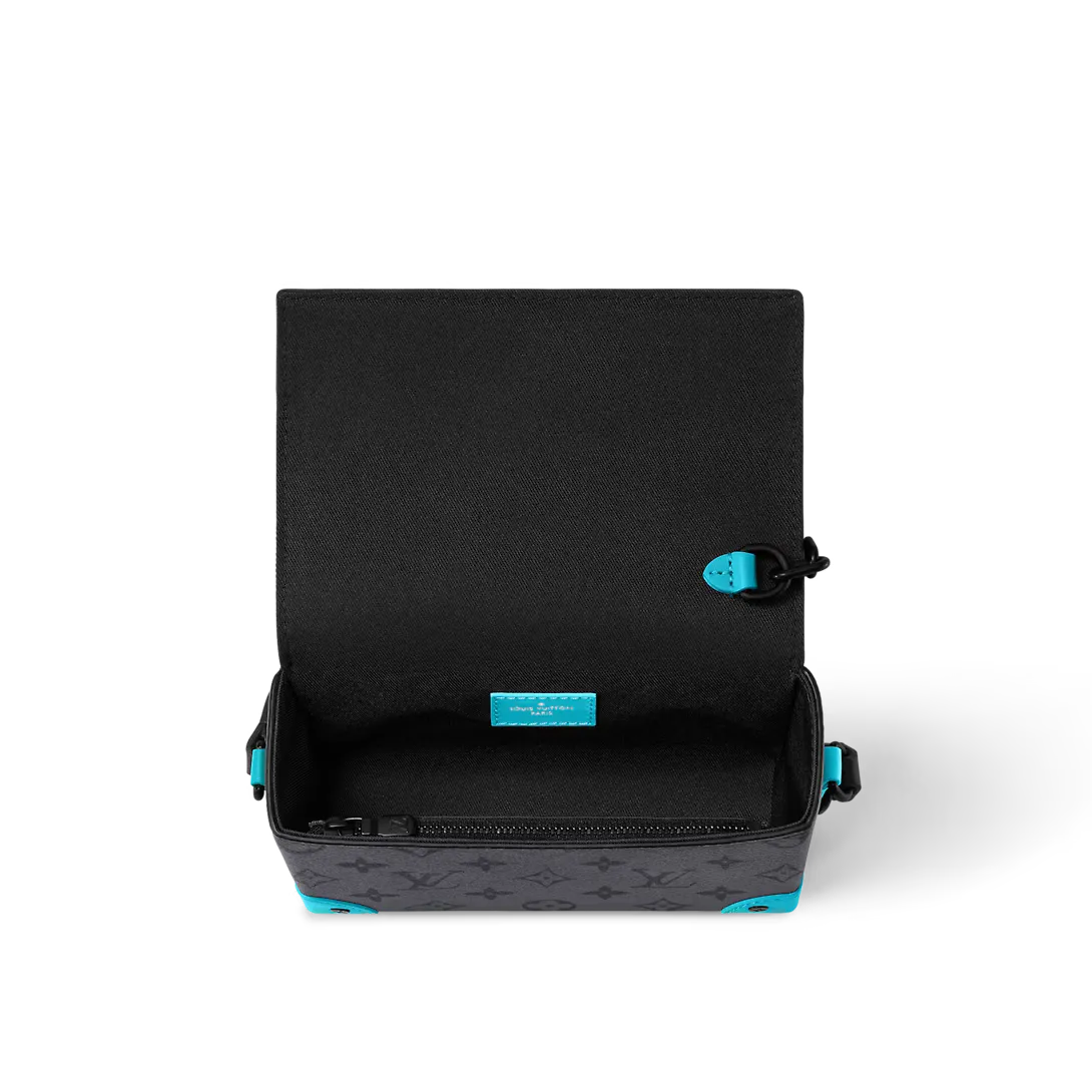 モノグラムエクリプス リバース キャンバスに染色したカウハイドレザーのトリミングをあしらい、夏らしい雰囲気にアップデートしたスティーマーウェアラブル ウォレット。モノクロームのキャンバス地に、ヴィヴィッドなターコイズカラーの調節可能なストラップと補強を施したコーナー部分が彩りを添えます。特徴的なチェーンやピンの留め具と補強をしたコーナー部分に添えたビス(鋲)などメタルパーツはブラックで仕上げました。