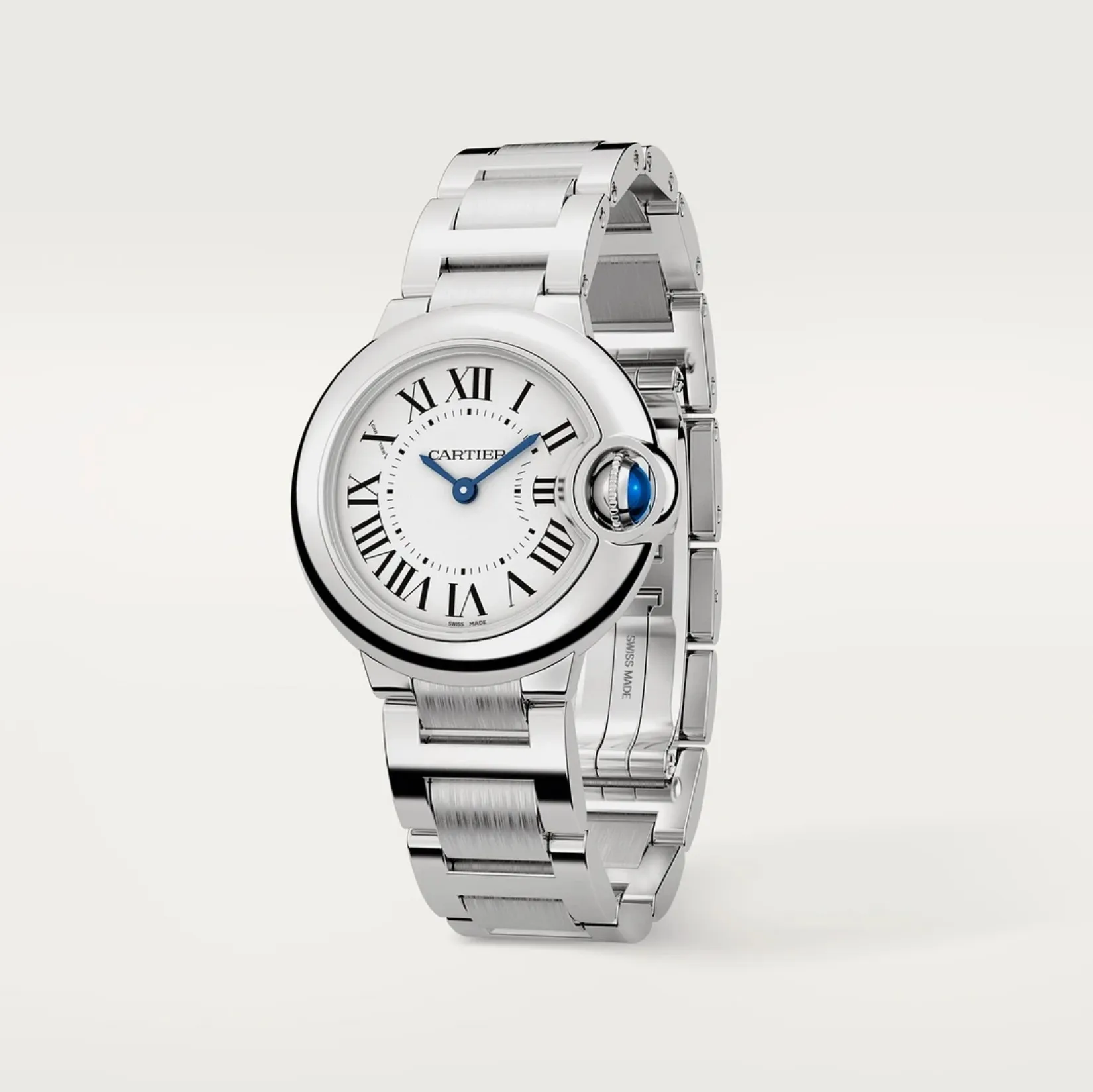 バロン ブルー ドゥ カルティエ ウォッチ、28mm、クォーツムーブメント。スティール製ケース、縦溝のあるリューズにシンセティック スピネル カボション、シルバー オパライン ダイアル、ローマ数字、ブルースティール製剣型針、サファイア クリスタル、スティール製ブレスレット。ケースサイズ(直径):28mm、厚さ:9.35mm。日常生活防水。