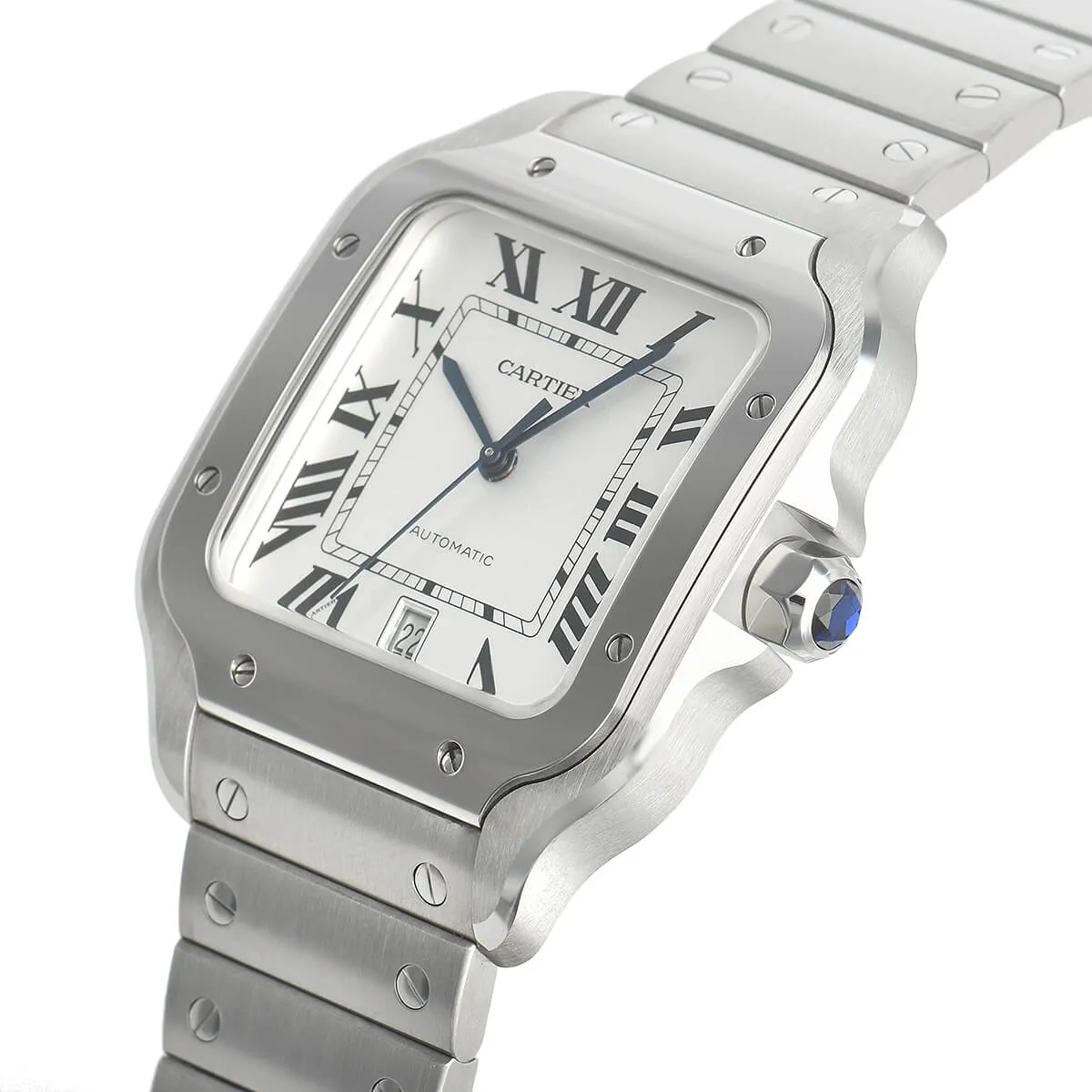 サントス ウォッチ、XL、キャリバー 1904 CH MC 自動巻きメカニカル クロノグラフムーブメント マニュファクチュール。スティール製ケース、ADLC加工ベゼル、七角形のリューズにファセットを施した シンセティック ブラックスピネル、サテンブラッシュ仕上げシルバーダイアル、蛍光仕上げブラックスティール製剣型針、サファイアクリスタル。1本目にラバーストラップ、セカンド ブラック “Gomma” アリゲーターストラップにスティール製デプロワイヤントバックル。どちらのブレスレット(ストラップ)にも「クィックスイッチ」交換可能システムを搭載。ケース幅:43.3 mm、ケースの厚さ:12.4 mm。10気圧(約100m)防水。