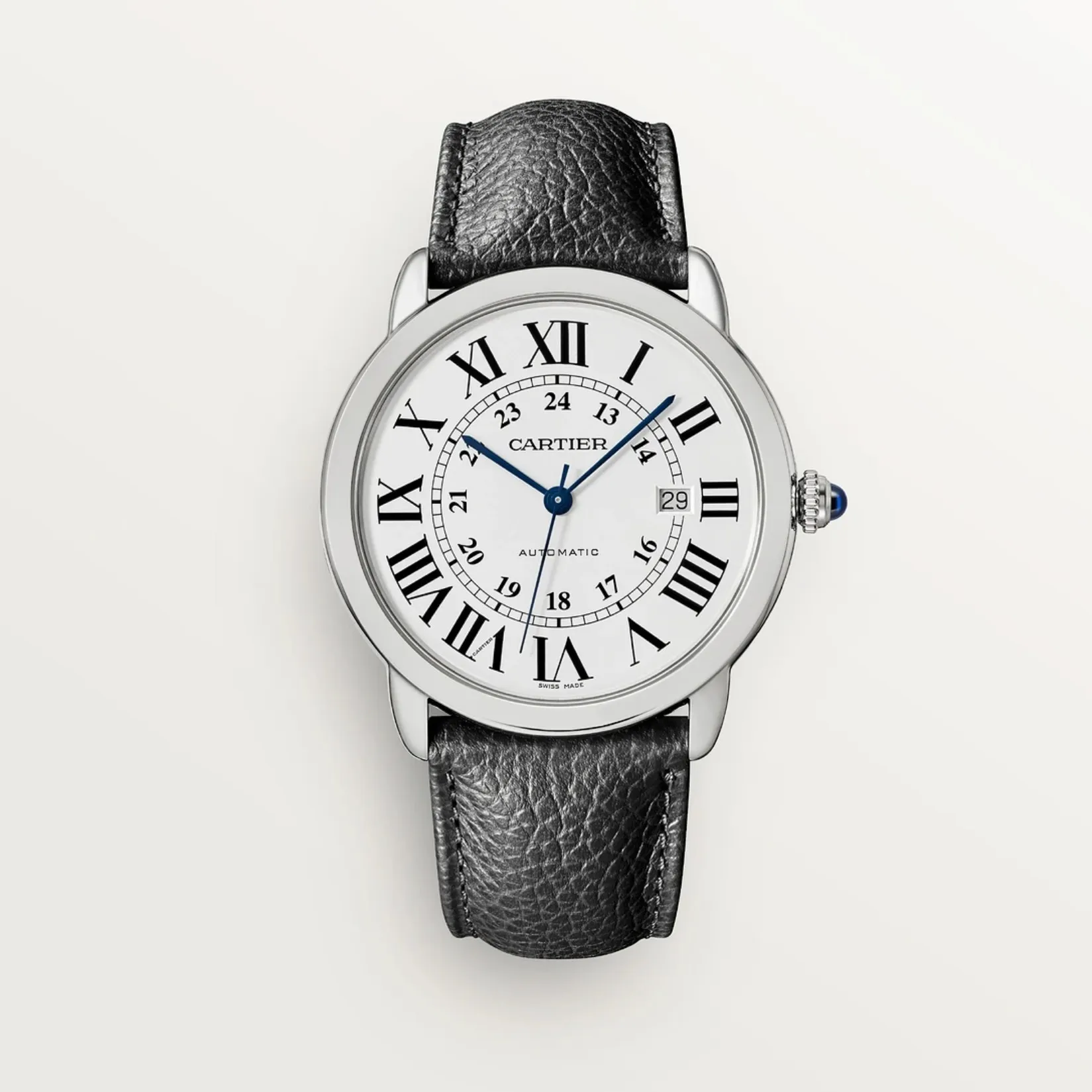 ロンド ソロ ドゥ カルティエ ウォッチ、42 mm、自動巻きメカニカルムーブメント。スティール製ケース、パール状の飾り付きリューズにシンセティック カボションシェイプ スピネル、シルバー オパライン ダイアル、ブルースティール製剣型針、サファイア クリスタル、付替可能ブラック グレインド カーフスキン ストラップ、スティール製ダブルアジャスタブル デプロワイヤント バックル、3時位置にデイト表示。ケースの厚さ:8.36 mm、日常生活防水。