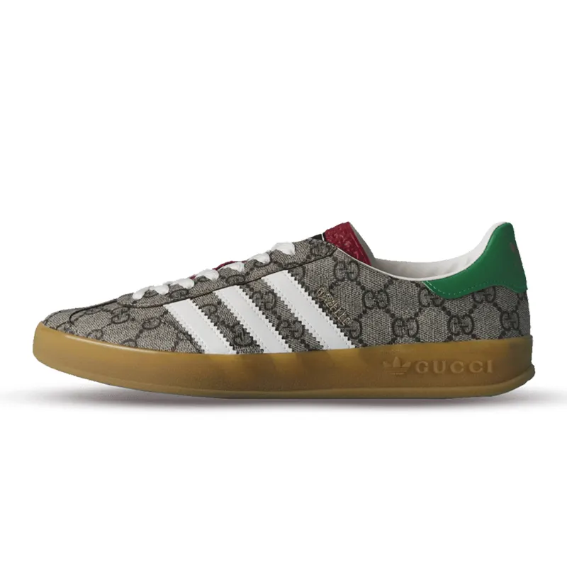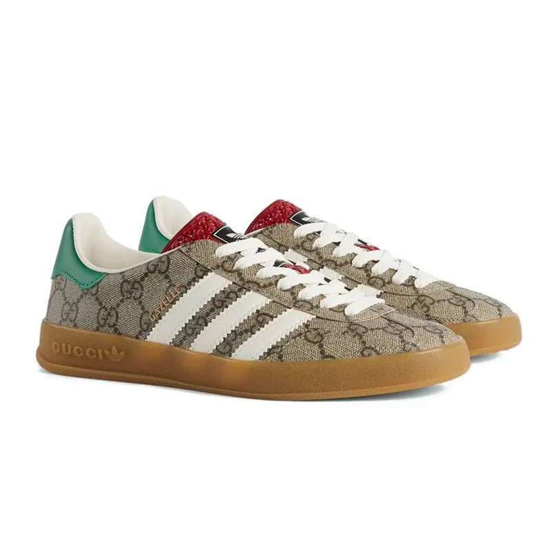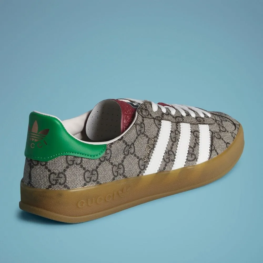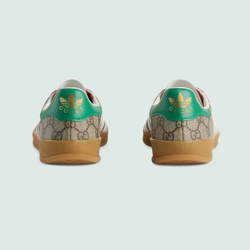 ウェブ ストライプとホワイトの3本線を融合させ、GGパターンとトレフォイルを組み合わせた、adidas x Gucci コレクションの第2弾。クリエイティブ・ディレクター、アレッサンドロ・ミケーレの1980年代から1990年代にかけての記憶を着想源に、グッチを象徴するモチーフと歴史あるスポーツウェアブランドであるアディダスのロゴをミックスすることで生まれた、ハイブリッドなラインです。グッチを象徴する〔ガゼル〕スニーカーを、ベージュ&エボニー GGスプリーム キャンバスで仕立てました。