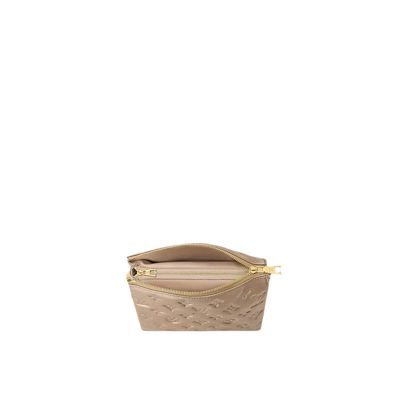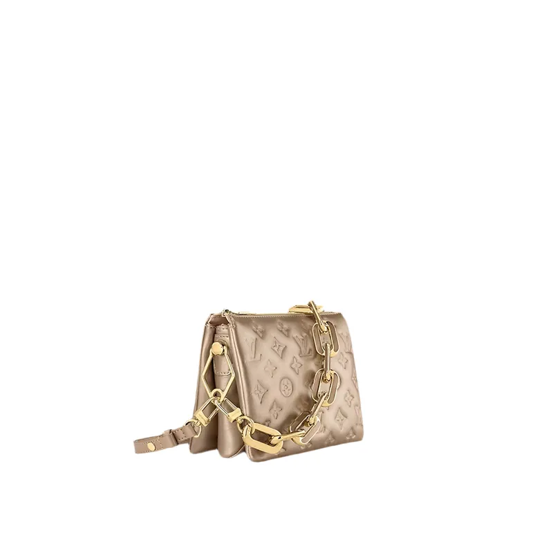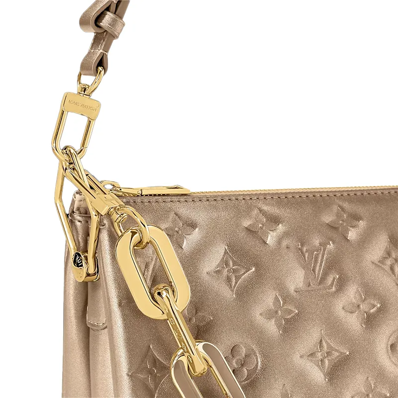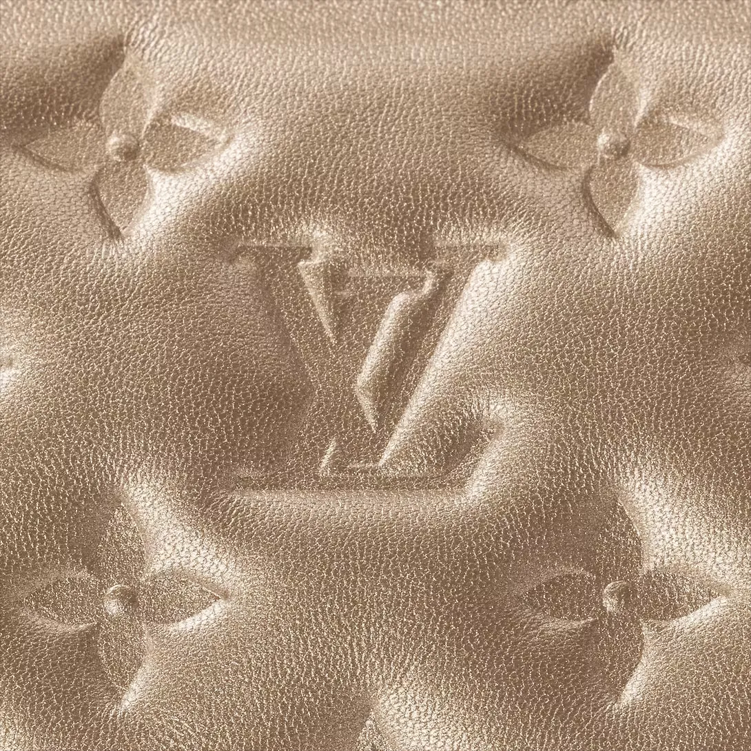 モノグラムパターンをエンボス加工した、パフ感溢れるライトゴールドカラーのラムレザーを使用したクッサン BB。グリッターのインサートを施した、レジン製の半透明のチェーンが特徴です。ショルダーバッグとして使用できるチャンキーなチェーンに加え、クロスボディバッグとしてもお楽しみいただける幅広の調節可能なストラップをあしらいました。内側には、ファスナー付きポケットで仕切られた、2つのコンパートメントを備えています。
