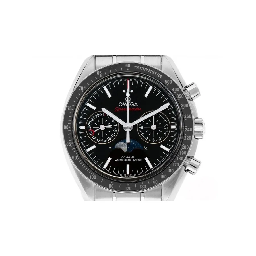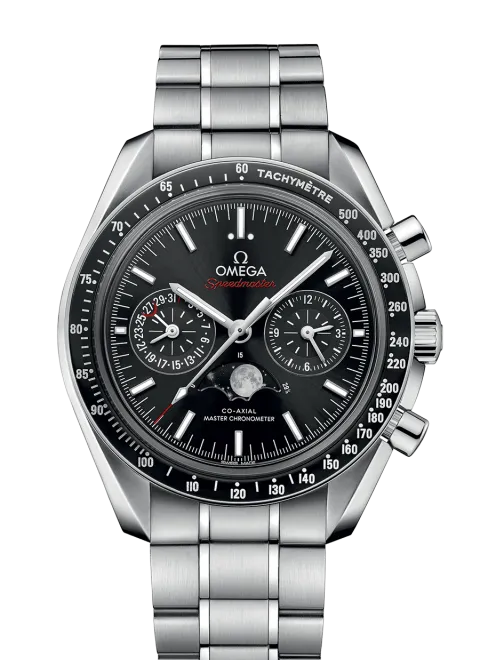 「スピードマスター」/「オメガ スピードマスター」は、6回の月面着陸プロジェクトに携帯された、オメガを代表するタイムピースのひとつです。更なる進化を遂げたこの新しいムーンフェイズモデルは、写実的な月が特徴です。 直径44.25mmのモデルは、サンブラッシュ仕上げのブラックダイアルに、ロジウムプレート仕上げのインデックスと針が配されています。 ステンレススティール製ケースには、リキッドメタル®のタキメータースケールを備えるブラックセラミック製ベゼルリングと、ポリッシュ仕上げとサテン仕上げのフォールディングクラスプ、ステンレススティール製ブレスレットが取り付けられています。